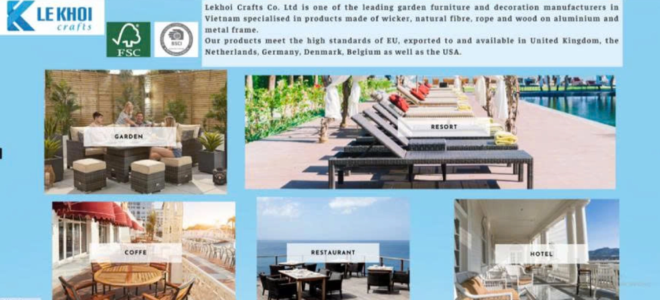 Lekhoi Crafts Co. Ltd is one of the leading garden furniture and decoration manufacturers in Vietnam specialised in products made of wicker, natural fibre, rope and wood on aluminium and metal frame.